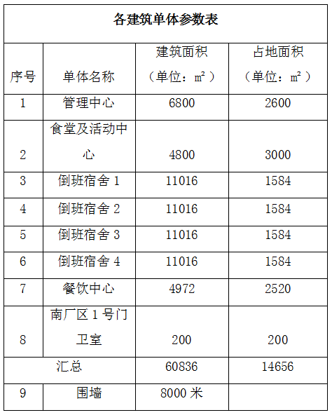 4、采購(gòu)項(xiàng)目?jī)?nèi)容包括:管理中心、食堂及活動(dòng)中心、倒班宿舍(暫定四棟)、餐飲中心、南廠區(qū)門(mén)衛(wèi)室、圍墻立面概念設(shè)計(jì),各單體參數(shù)如下表: