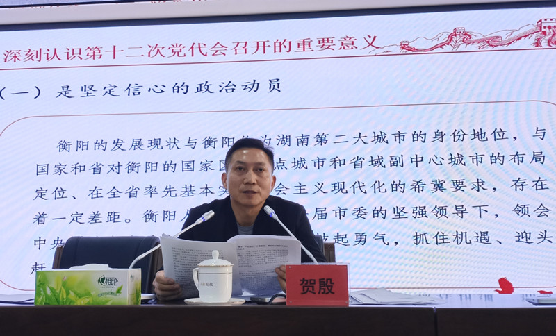 市第十二次黨代會(huì)(本文簡(jiǎn)稱(chēng)黨代會(huì))是在習(xí)近平總書(shū)記考察湖南一周年之際、“兩個(gè)一百年”奮斗目標(biāo)歷史交匯關(guān)鍵節(jié)點(diǎn)、全面建成社會(huì)主義現(xiàn)代化國(guó)家開(kāi)局之年召開(kāi)的一次十分重要的大會(huì)。按照市委、市政府工作部署,為深刻領(lǐng)會(huì)貫徹黨代會(huì)精神,弘湘國(guó)投組織召開(kāi)了專(zhuān)題宣講會(huì),為全體干部職工在以后的工作中提供思想和行動(dòng)指引。由市委宣講團(tuán)成員、市委黨校(衡陽(yáng)行政學(xué)院)常務(wù)副校(院)長(zhǎng)賀殷宣講,弘湘國(guó)投黨委書(shū)記、董事長(zhǎng)劉軍主持。