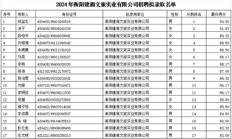 2024衡陽建湘文旅實業(yè)有限公司面向社會公開招聘擬錄取人員名單公示