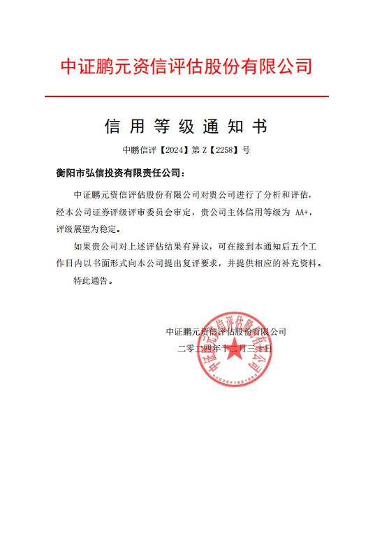 12月31日,衡陽(yáng)市國(guó)有資產(chǎn)投資控股集團(tuán)有限公司子公司衡陽(yáng)市弘信投資有限責(zé)任公司,被國(guó)內(nèi)權(quán)威信用評(píng)級(jí)機(jī)構(gòu)中證鵬元資信評(píng)估股份有限公司認(rèn)定主體長(zhǎng)期信用等級(jí)為 AA+,評(píng)級(jí)展望為穩(wěn)定。